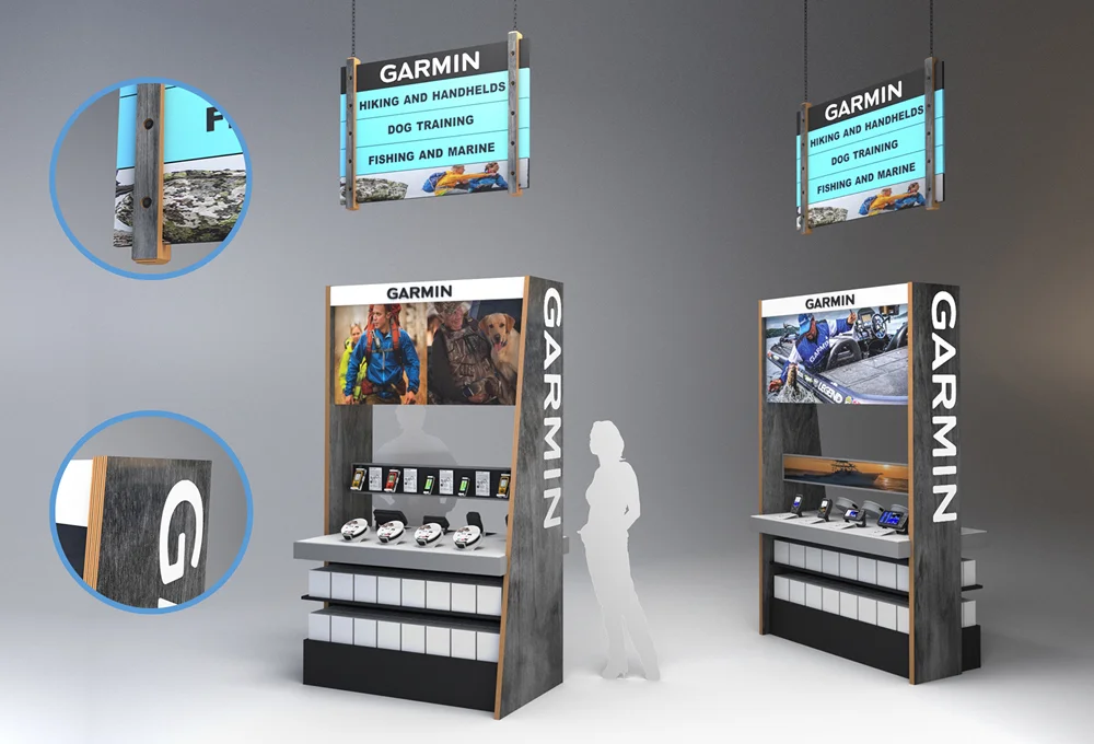 Display for Gander Outdoors blending the essence of the brand and the retailer with stained weathered gray Baltic birch plywood structures.